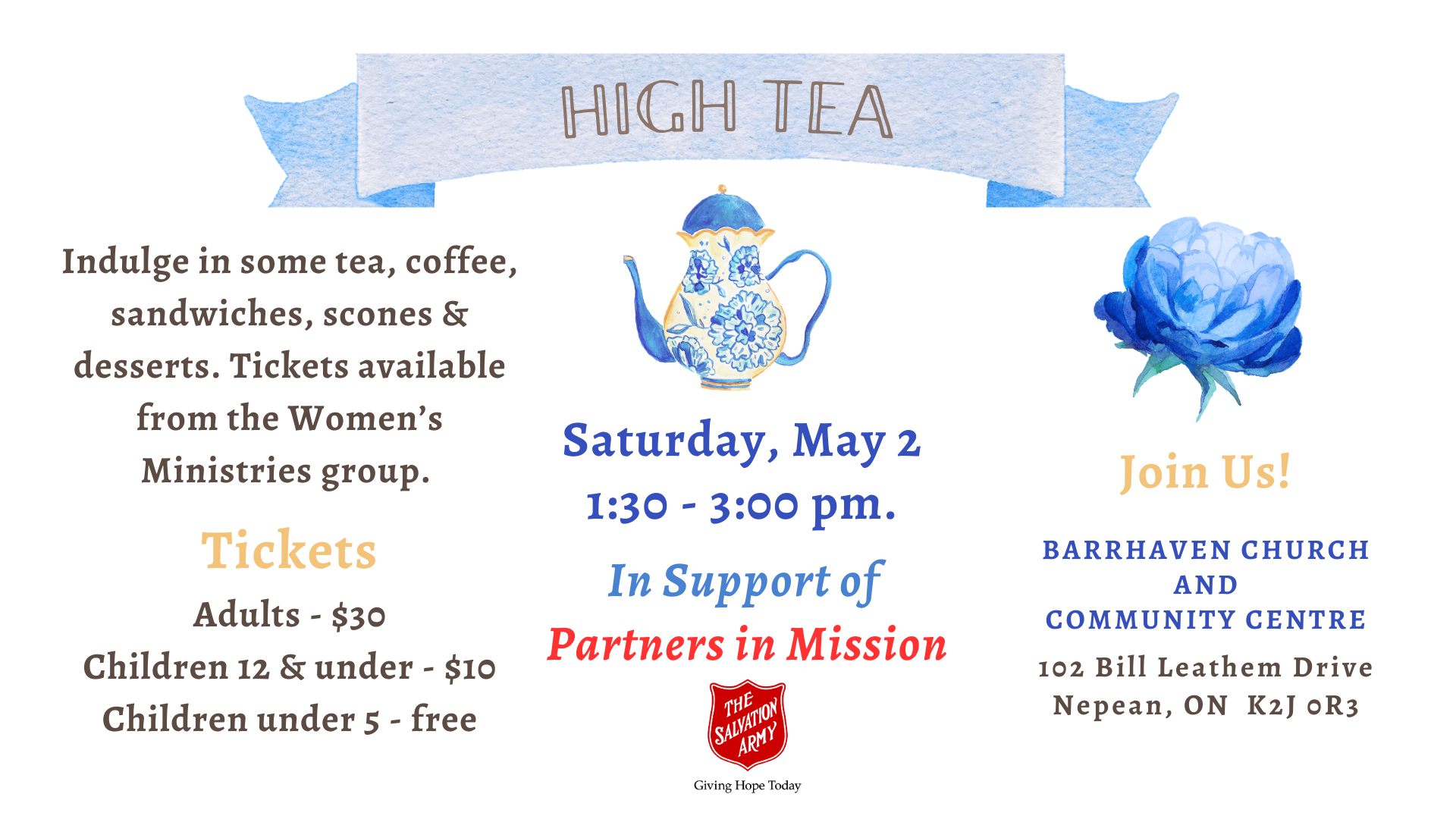 Join us for our annual High Tea in support of Partners in Mission! Enjoy a lovely afternoon filled with hot drinks, delicious sandwiches, and sweet treats.